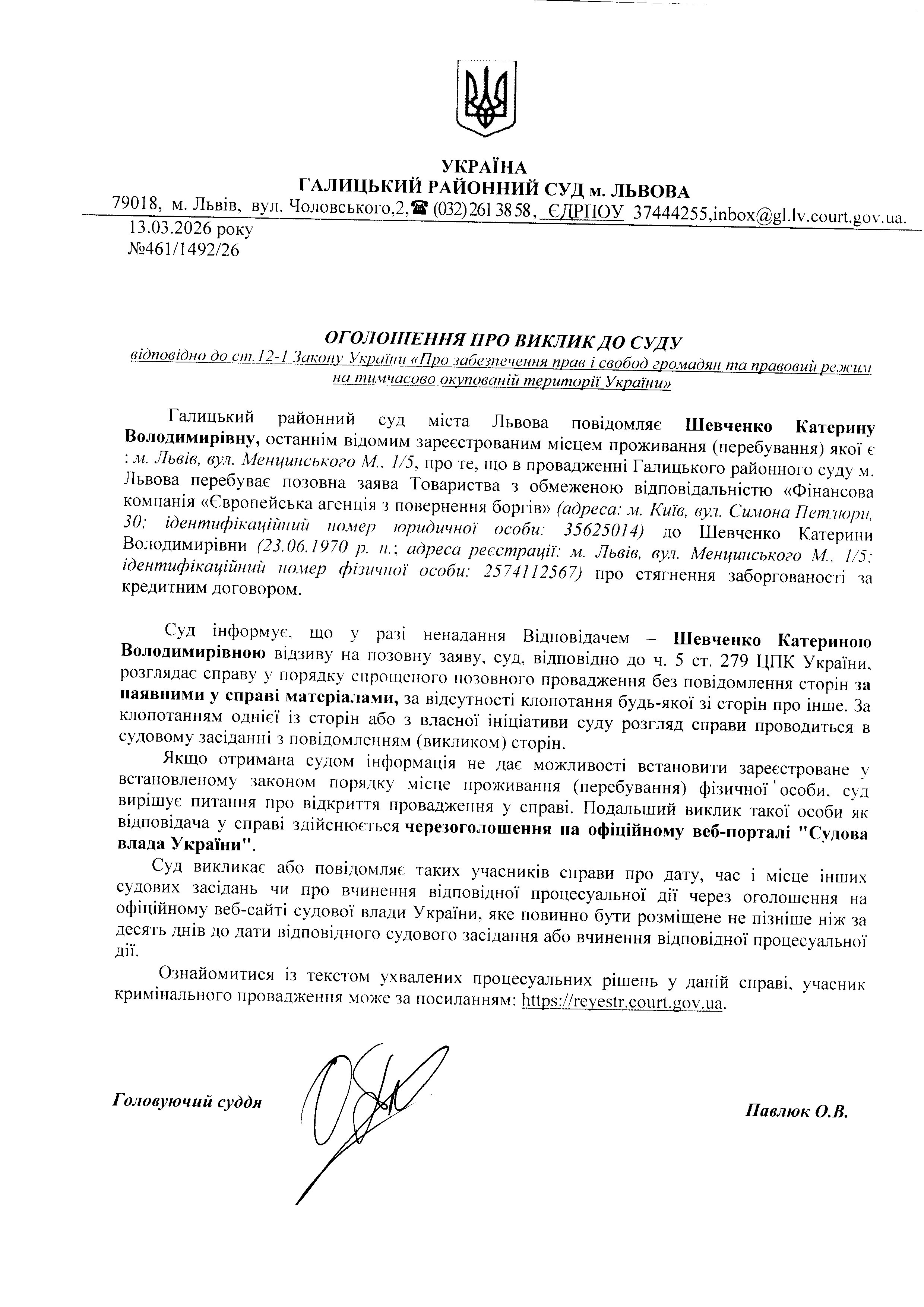 Оголошення про виклик до суду Шевченко К.В.
