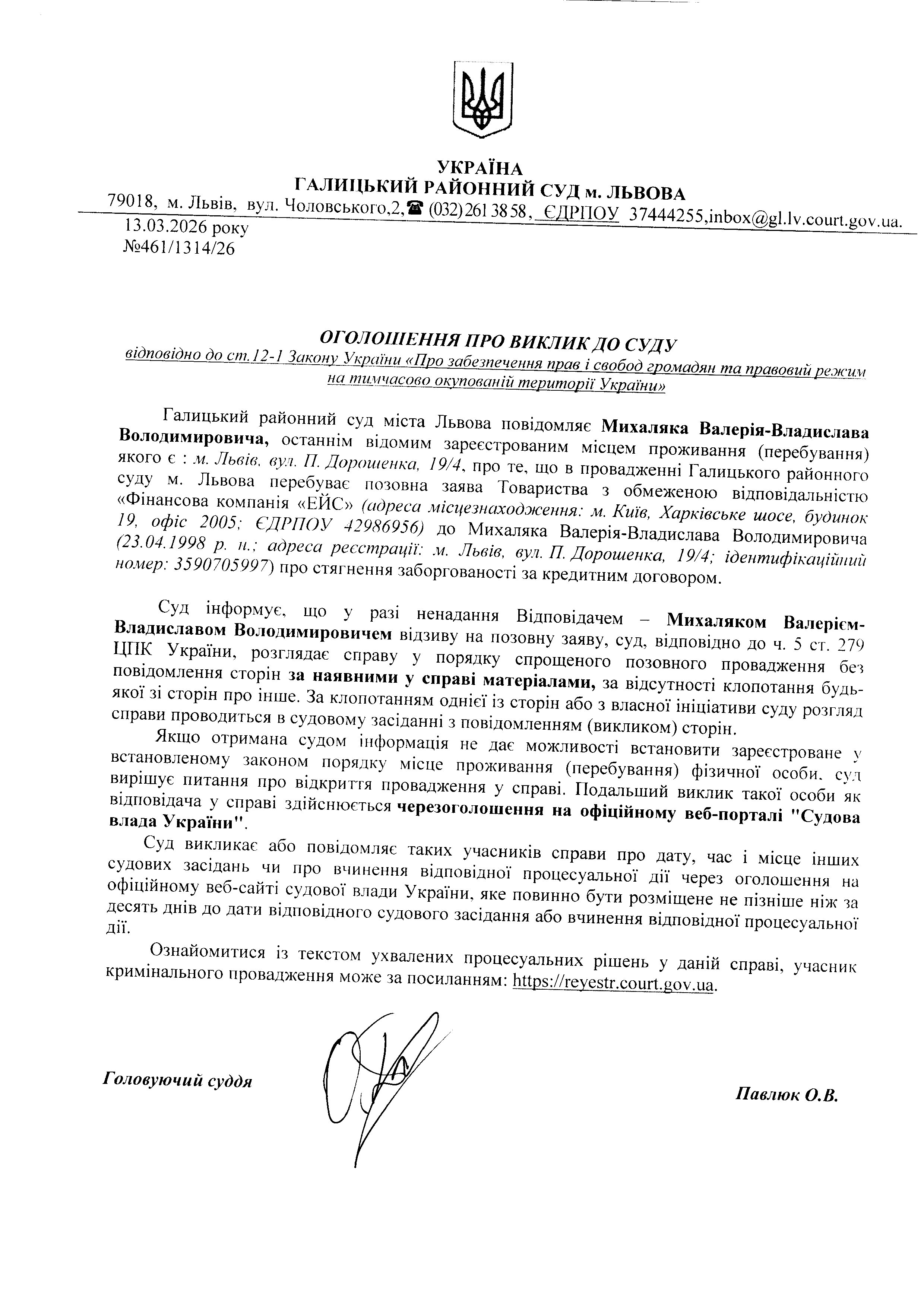 Оголошення про виклик до суду Михаляка В.-В.В.