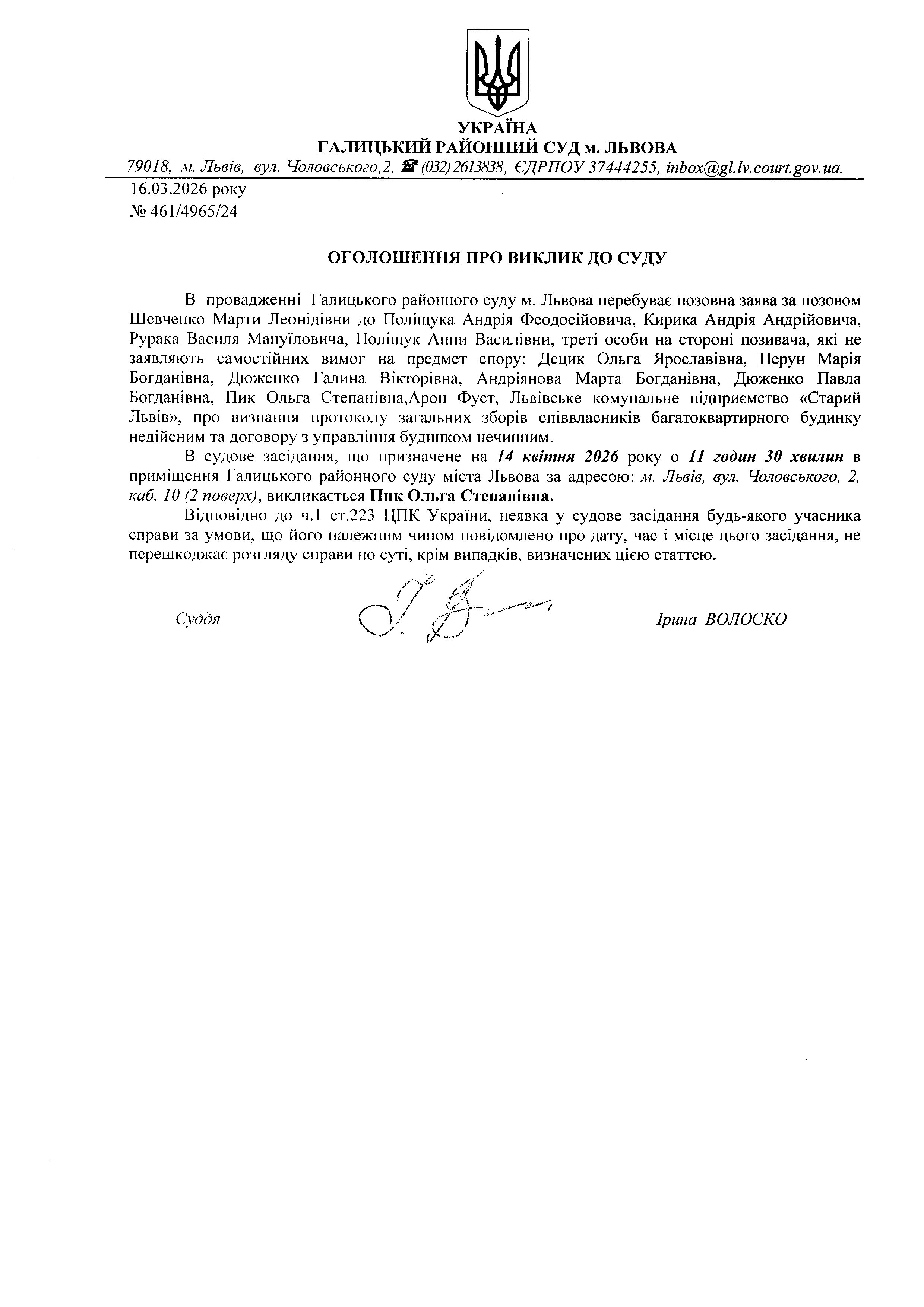 Оголошення про виклик до суду Пик О.С.