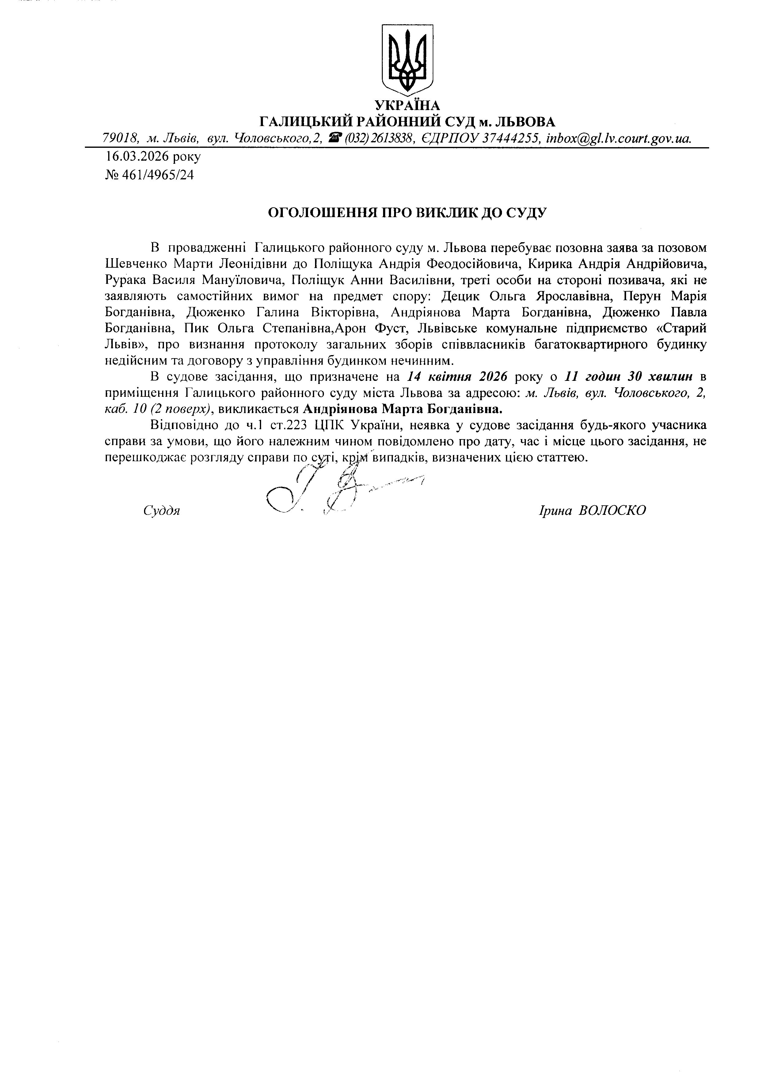 Оголошення про виклик до суду Андріянова М.Б.