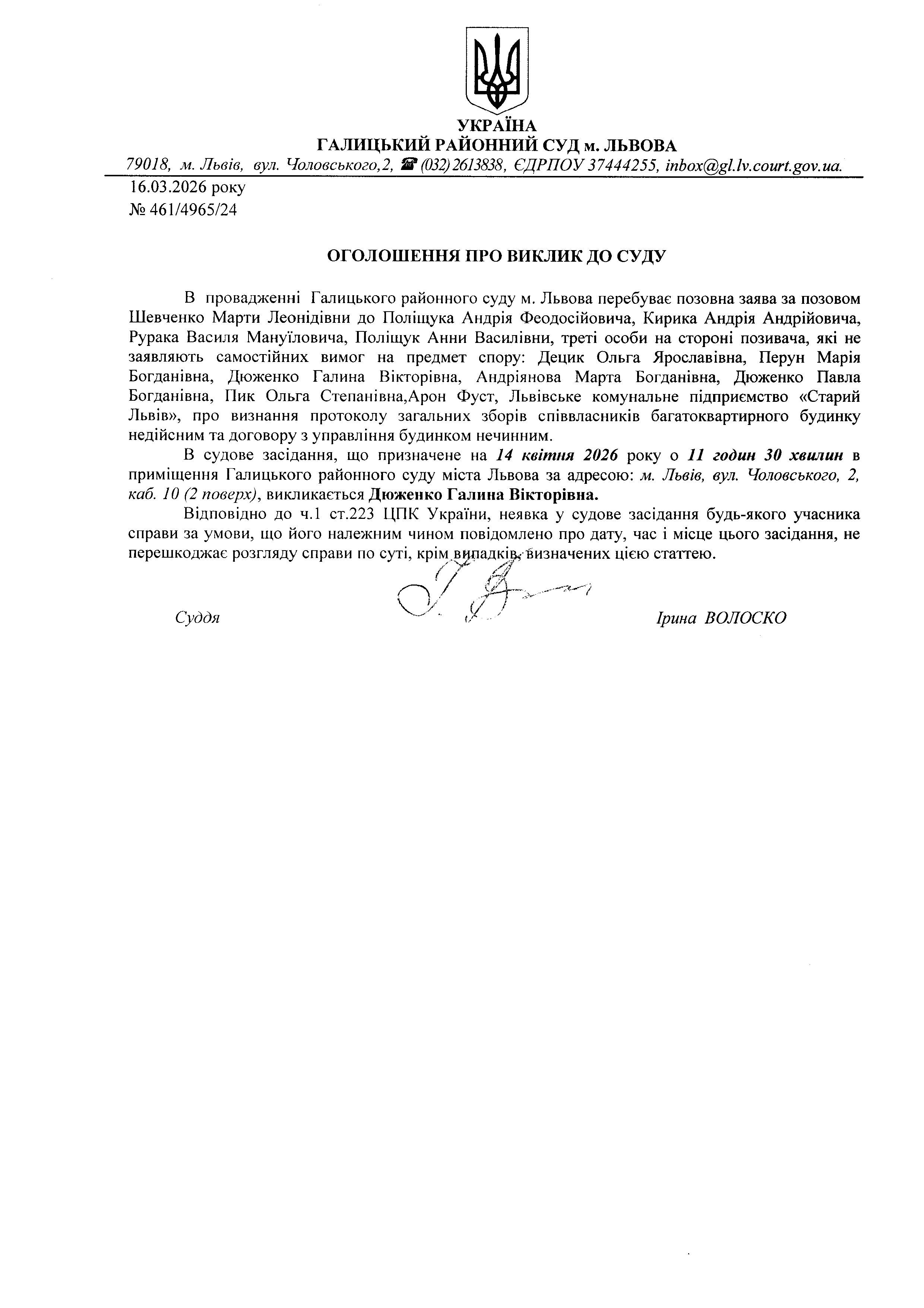Оголошення про виклик до суду Дюженко Г.В.