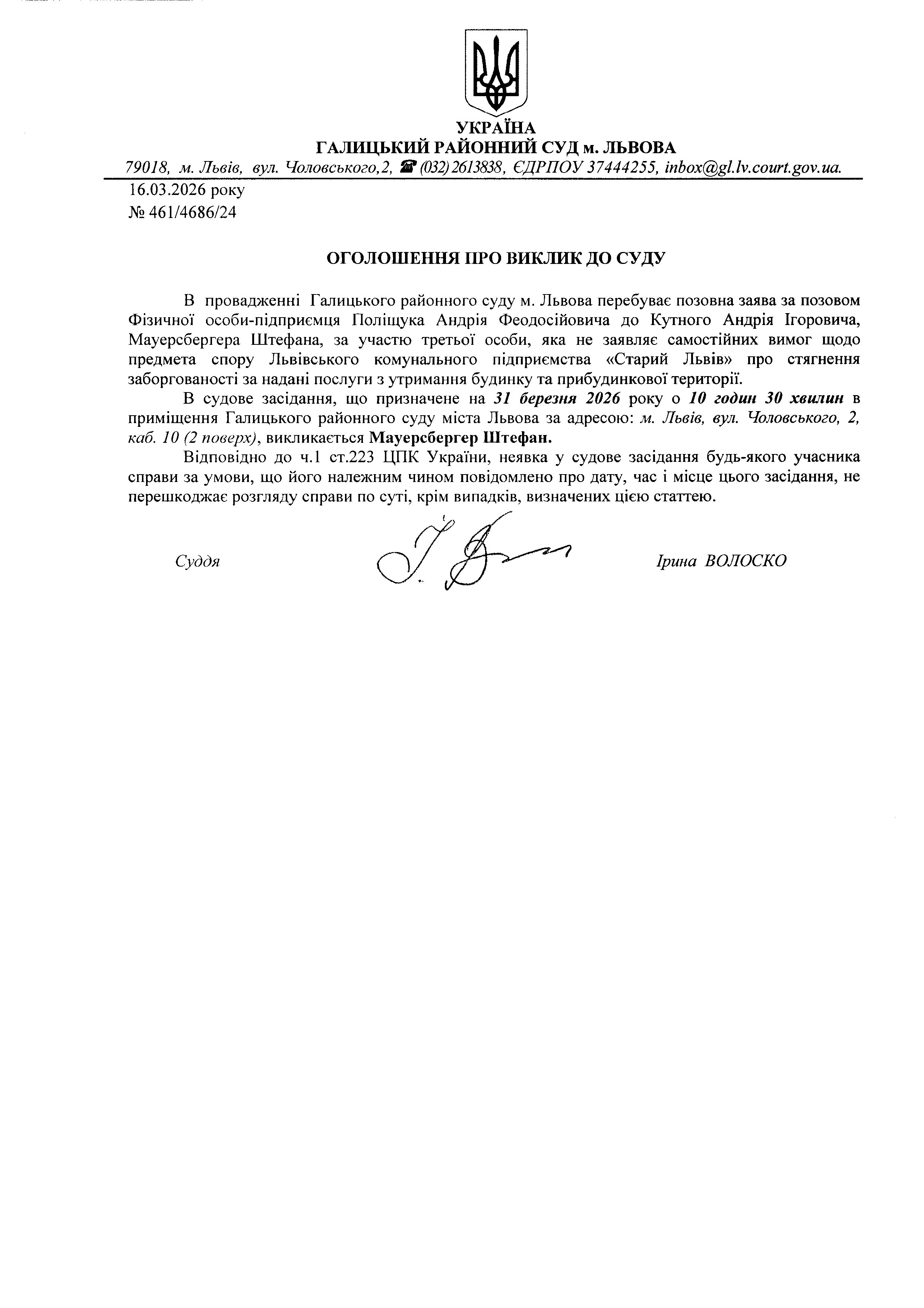 Оголошення про виклик до суду Мауерсбергер Ш.