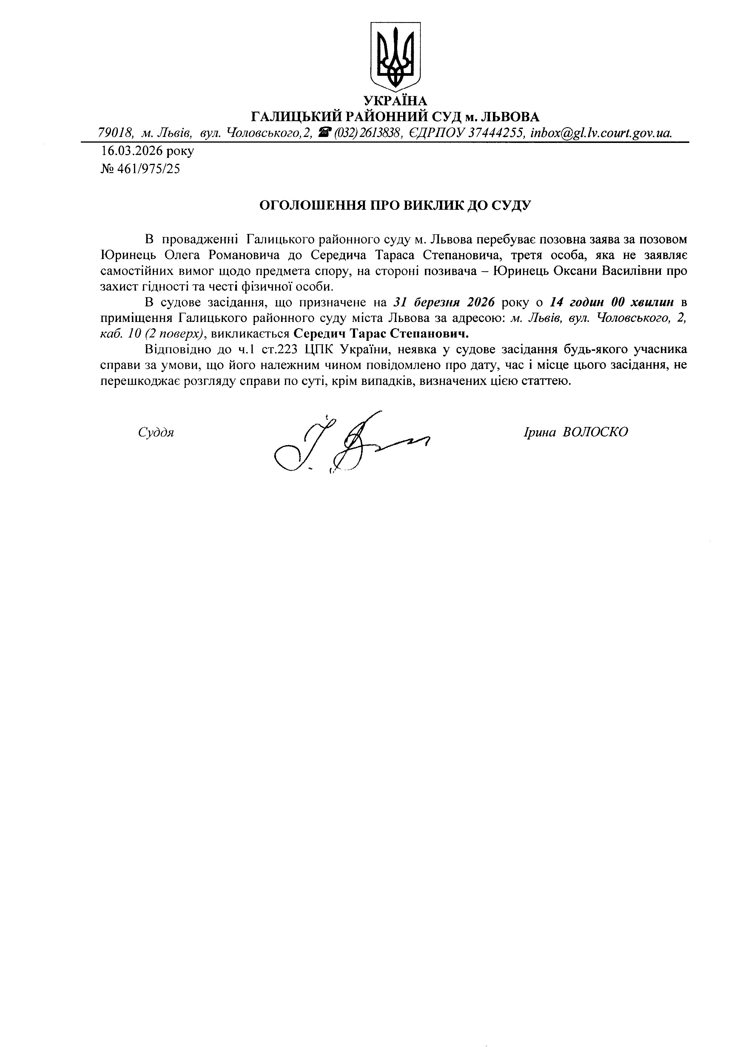 Оголошення про виклик до суду Середич Т.С.