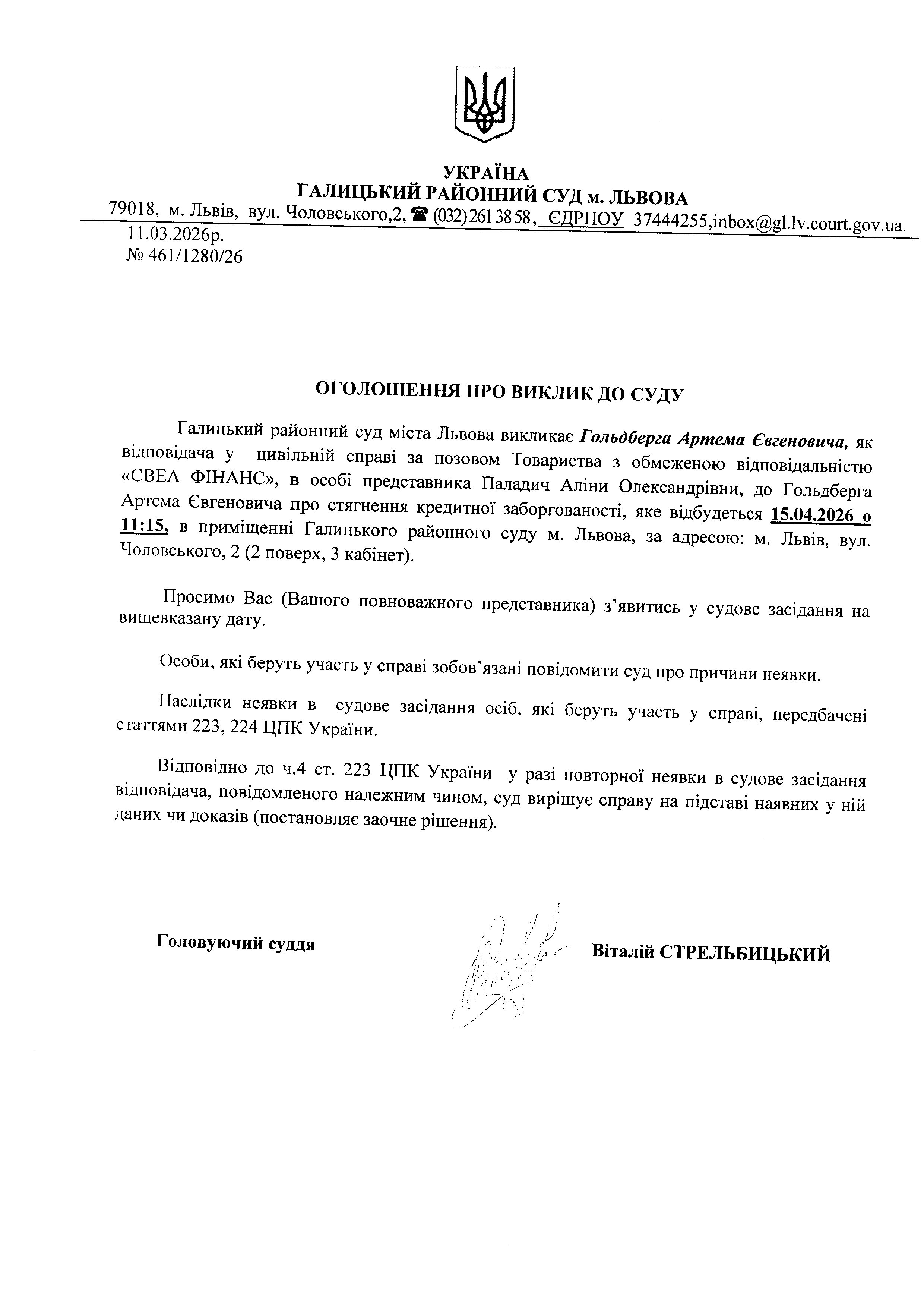 Оголошення про виклик до суду Гольдберга А.Є.
