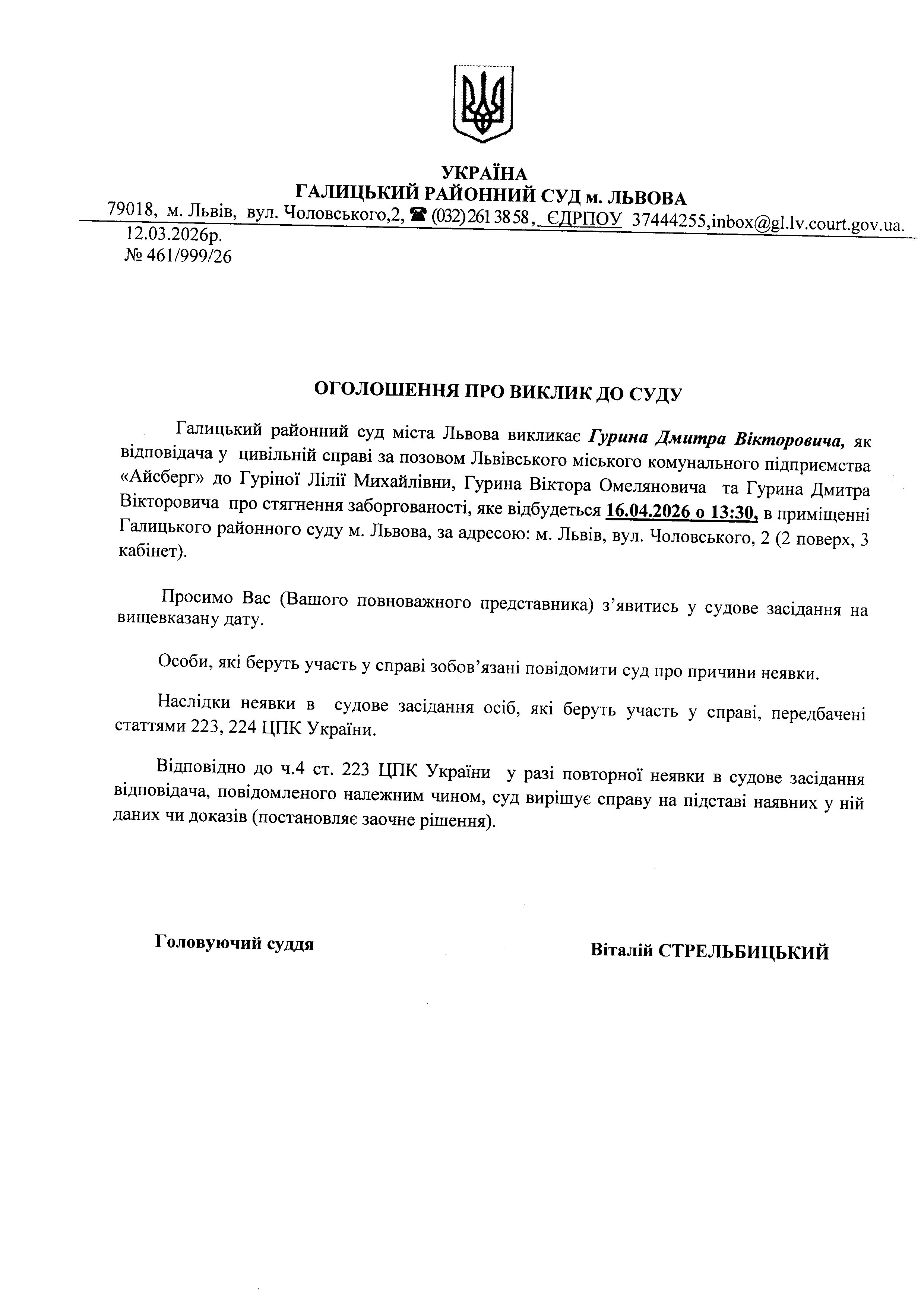 Оголошення про виклик до суду Гурина Д.В.