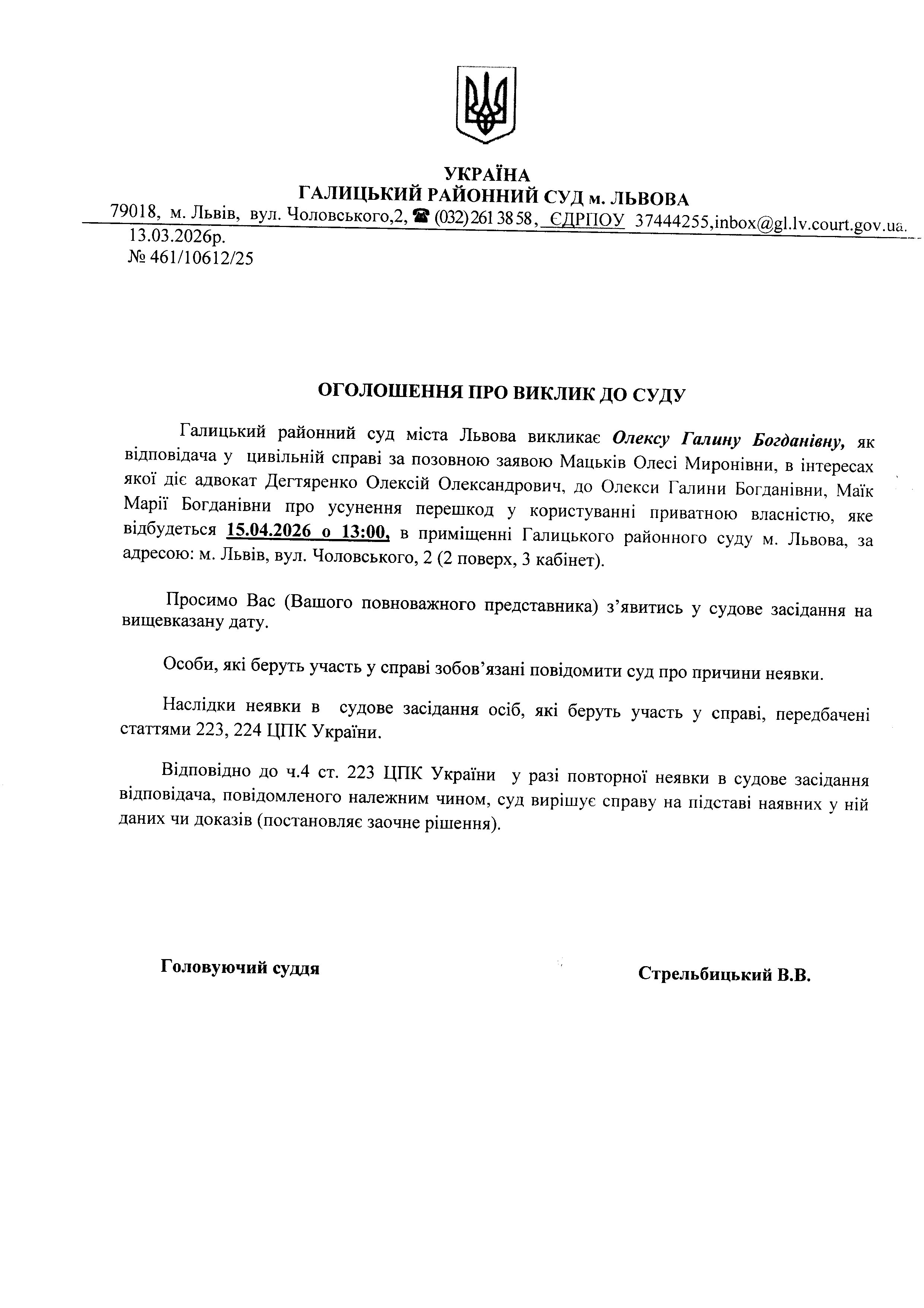 Оголошення про виклик до суду Олексу Г.Б.