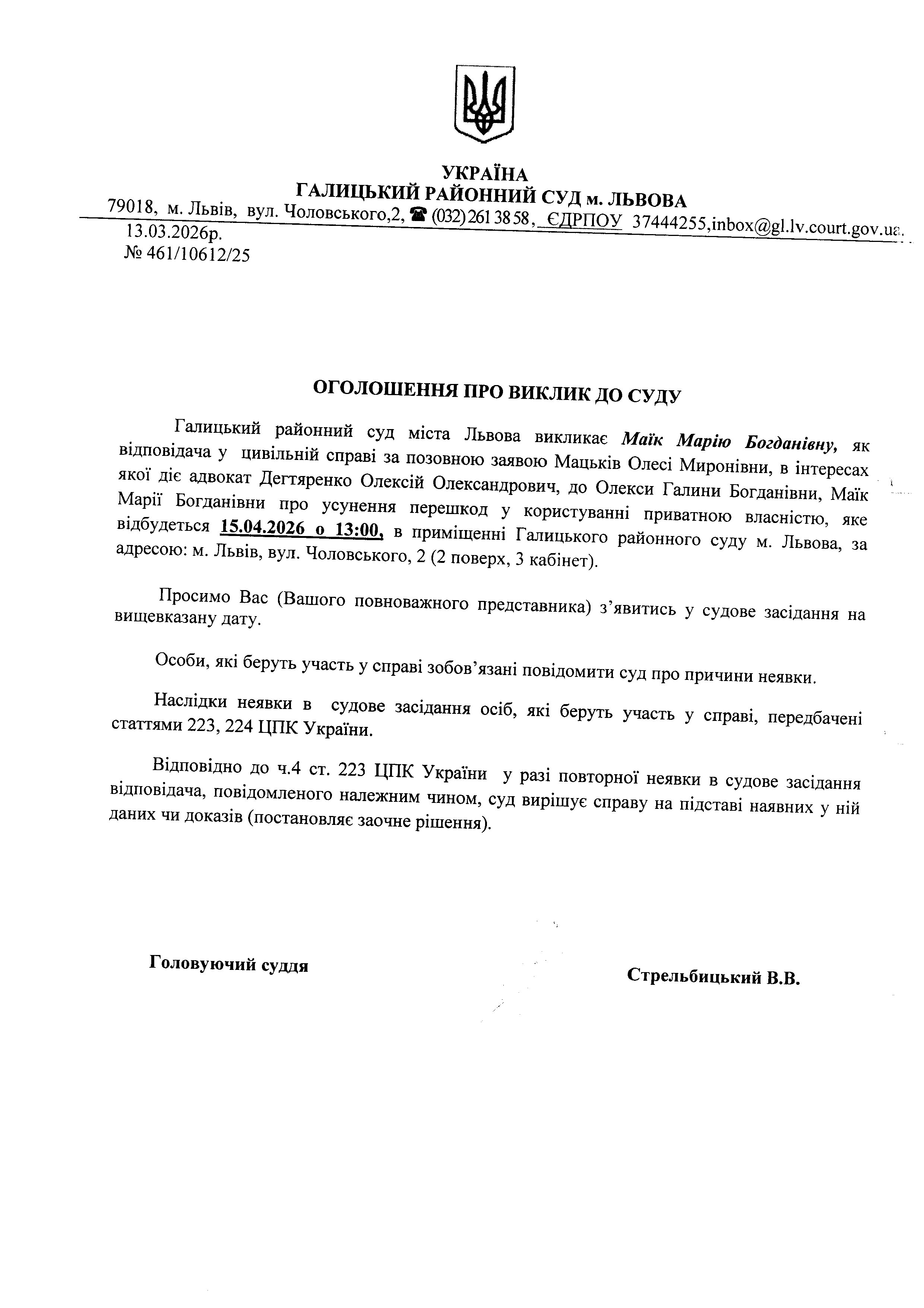 Оголошення про виклик до суду Маїк М.Б.