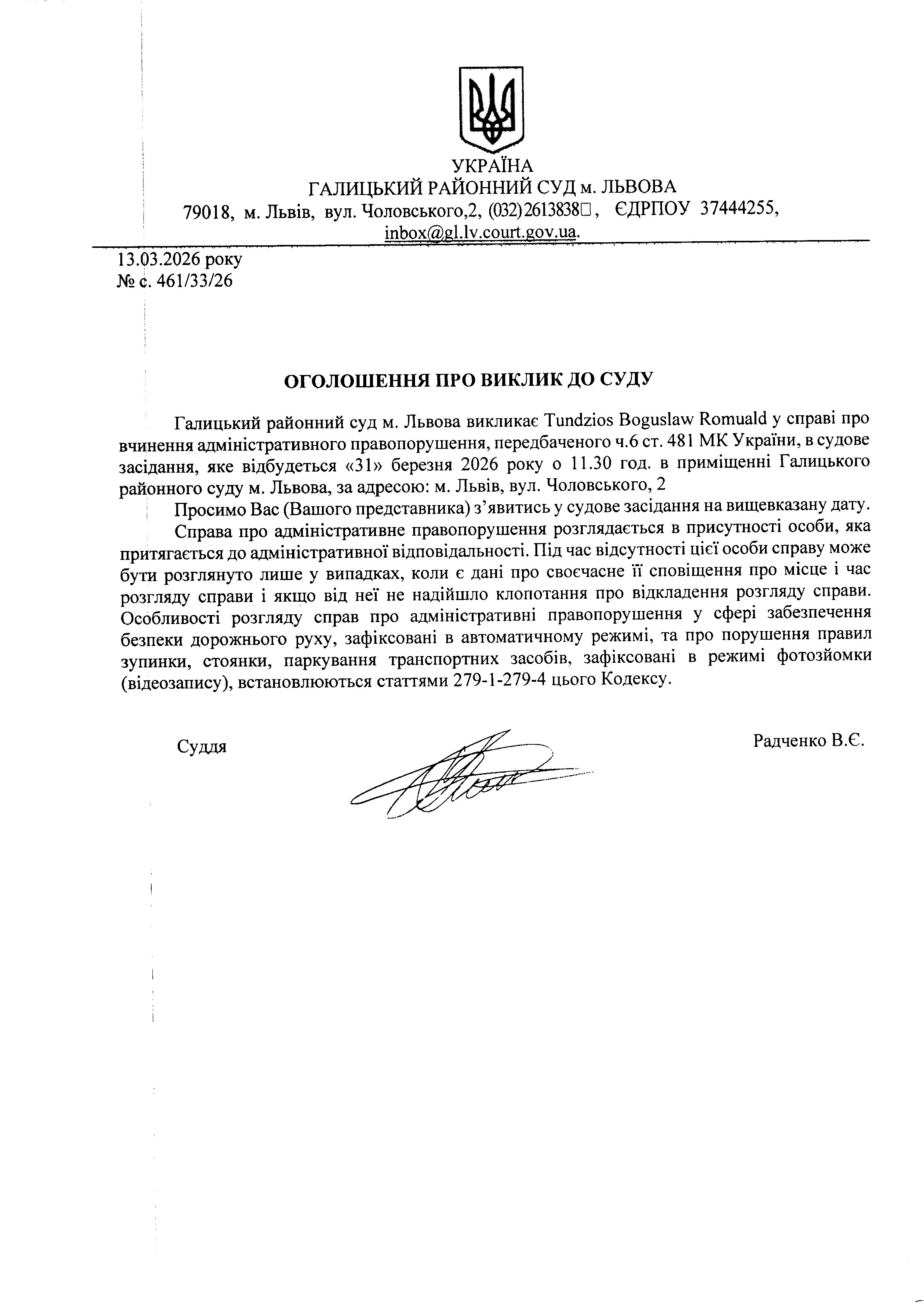 Оголошення про виклик до суду Tundzios B.R.