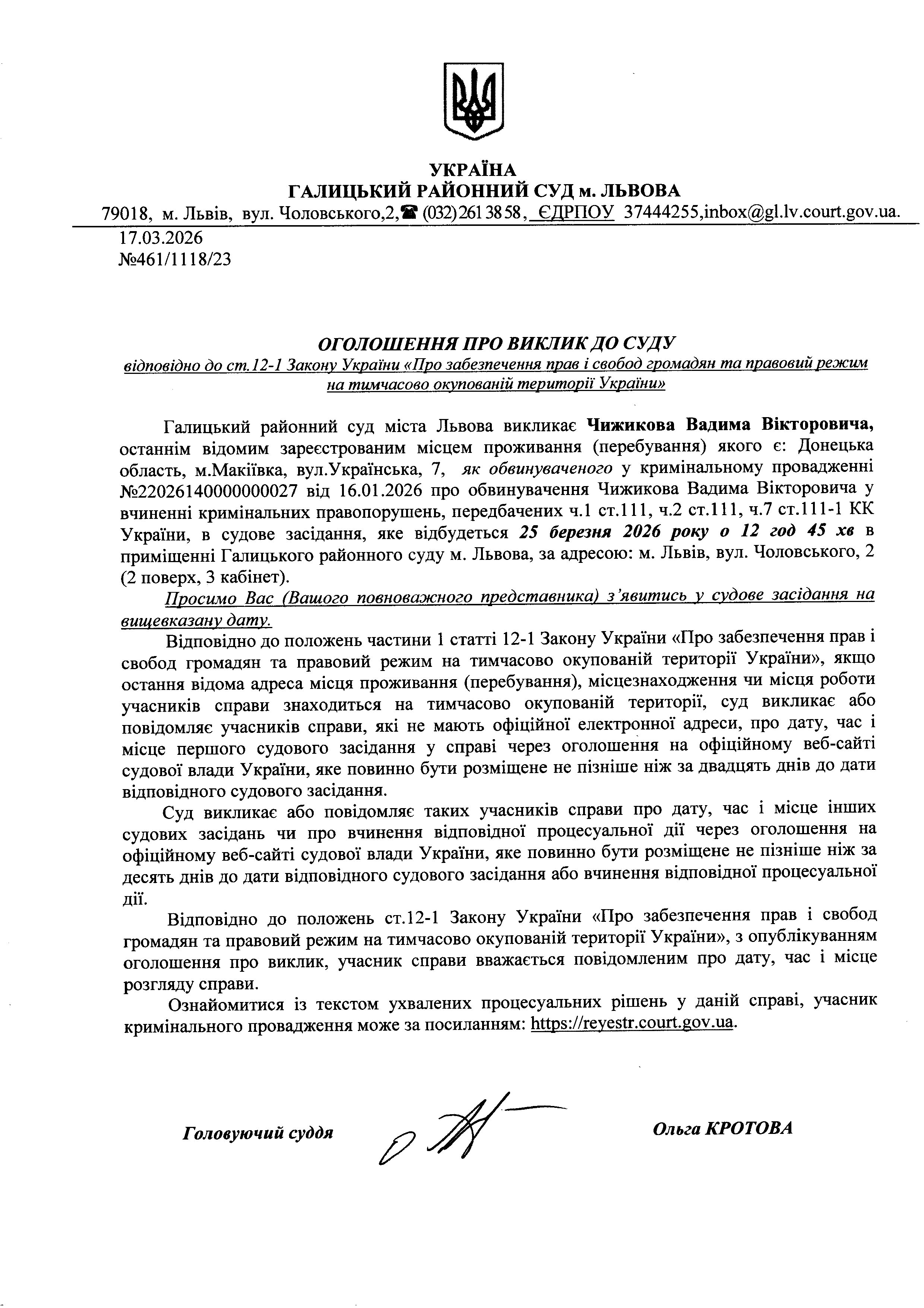 Оголошення про виклик до суду Чижикова В.В.