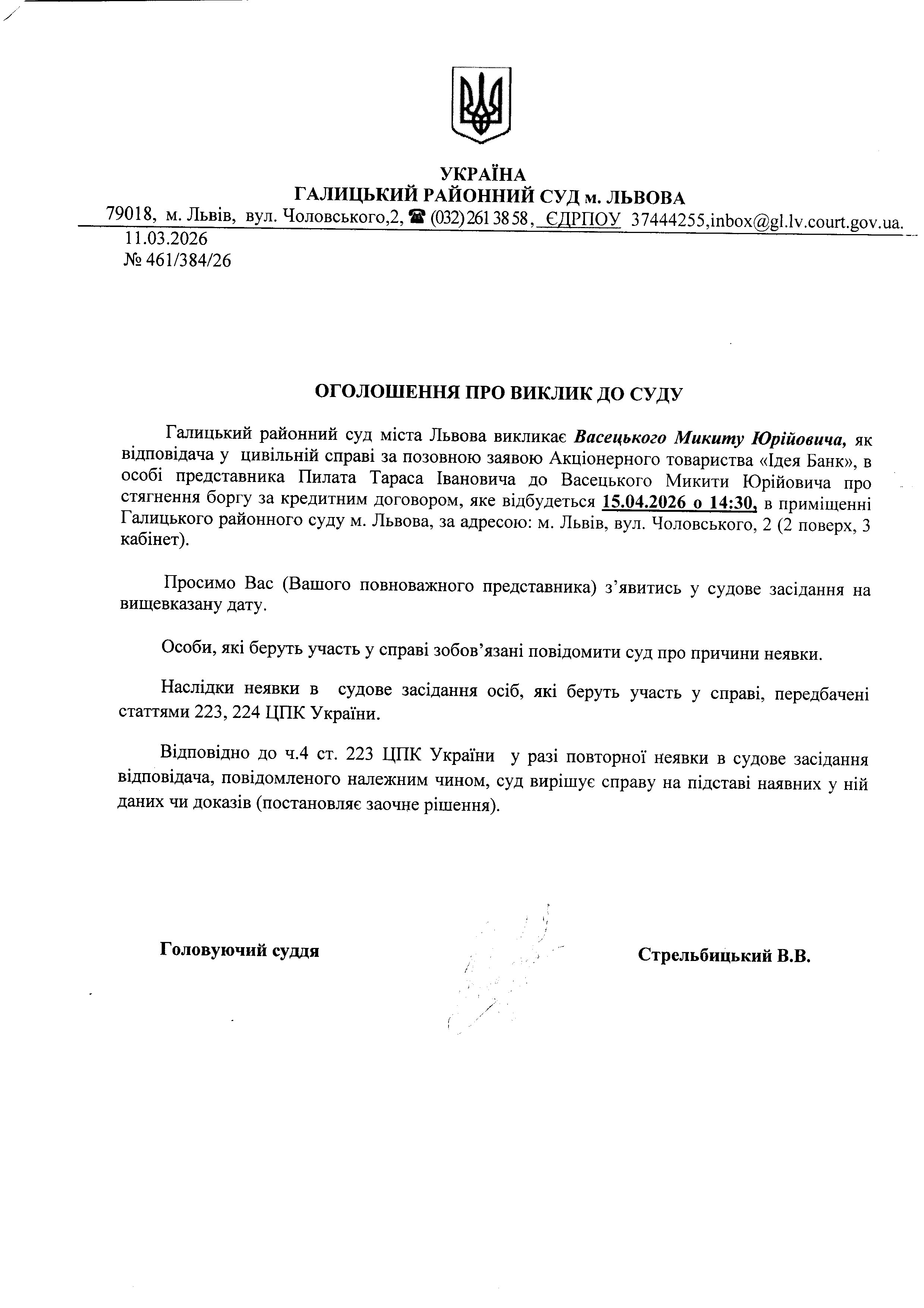 Оголошення про виклик до суду Васецького М.Ю.