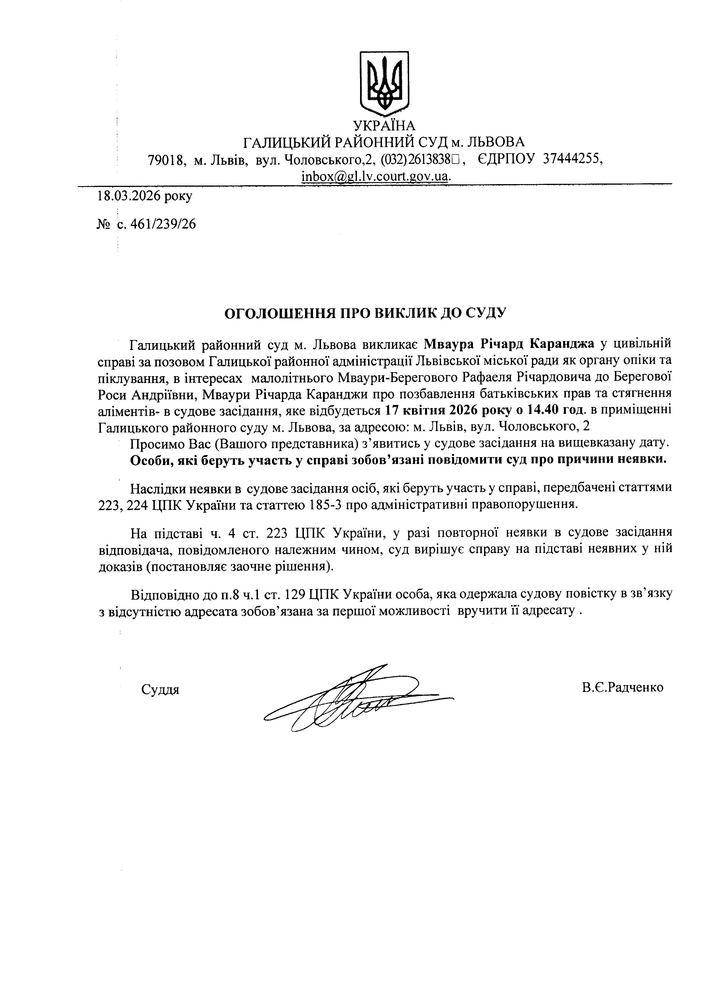 Оголошення про виклик до суду Мваура Р.К.