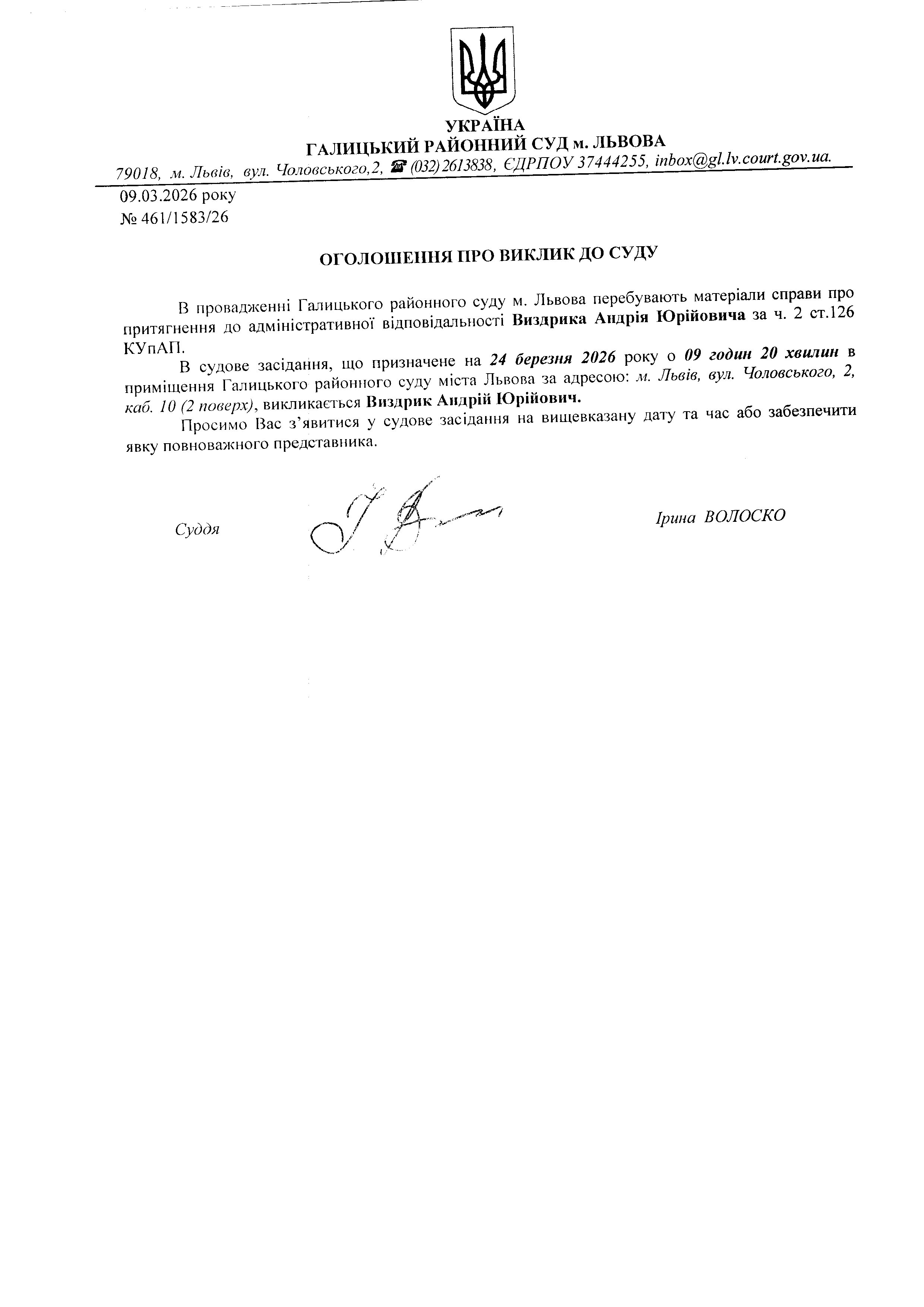 Оголошення про виклик до суду Виздрик А.Ю.