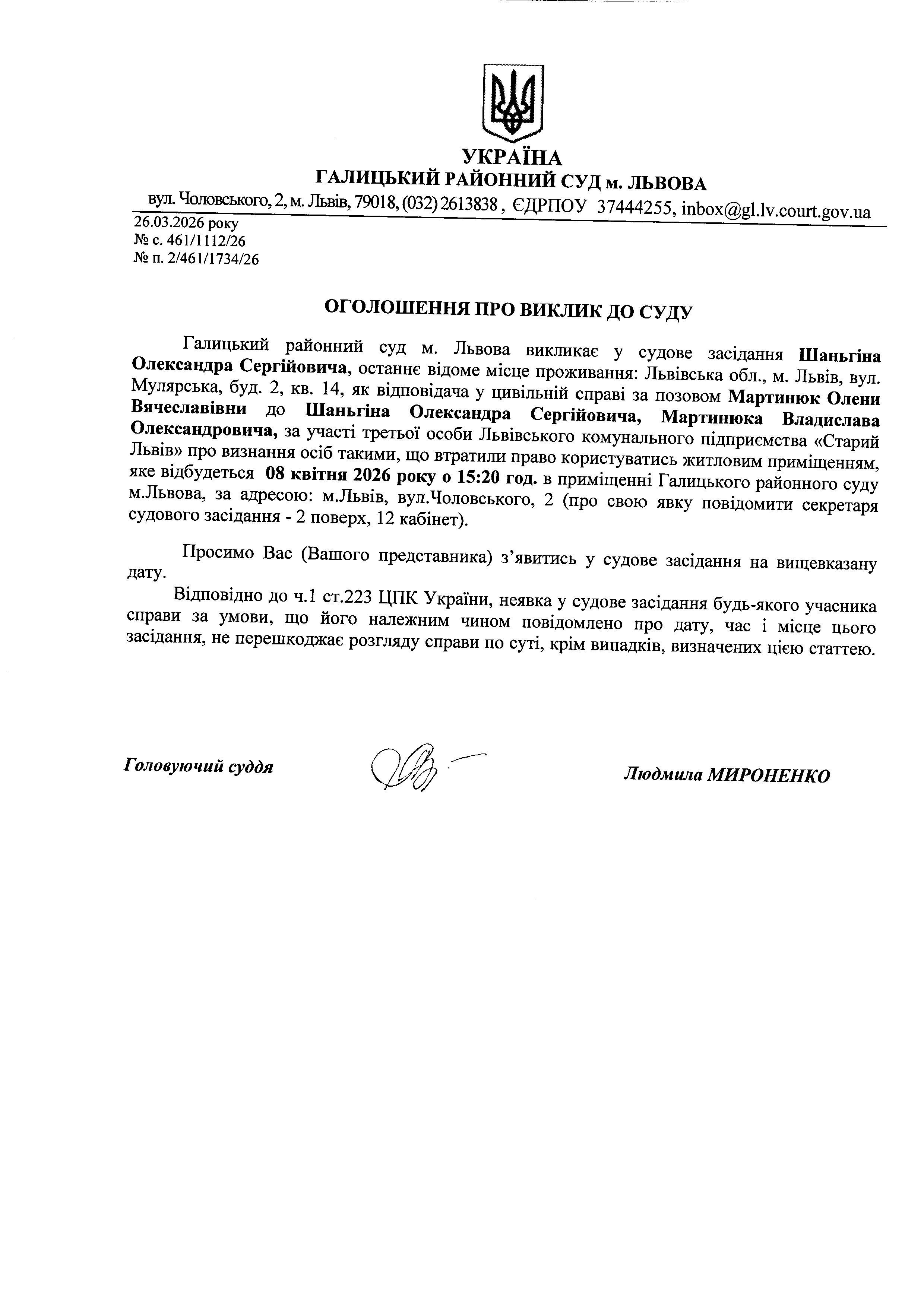 Оголошення про виклик до суду Шаньгіна О.С.