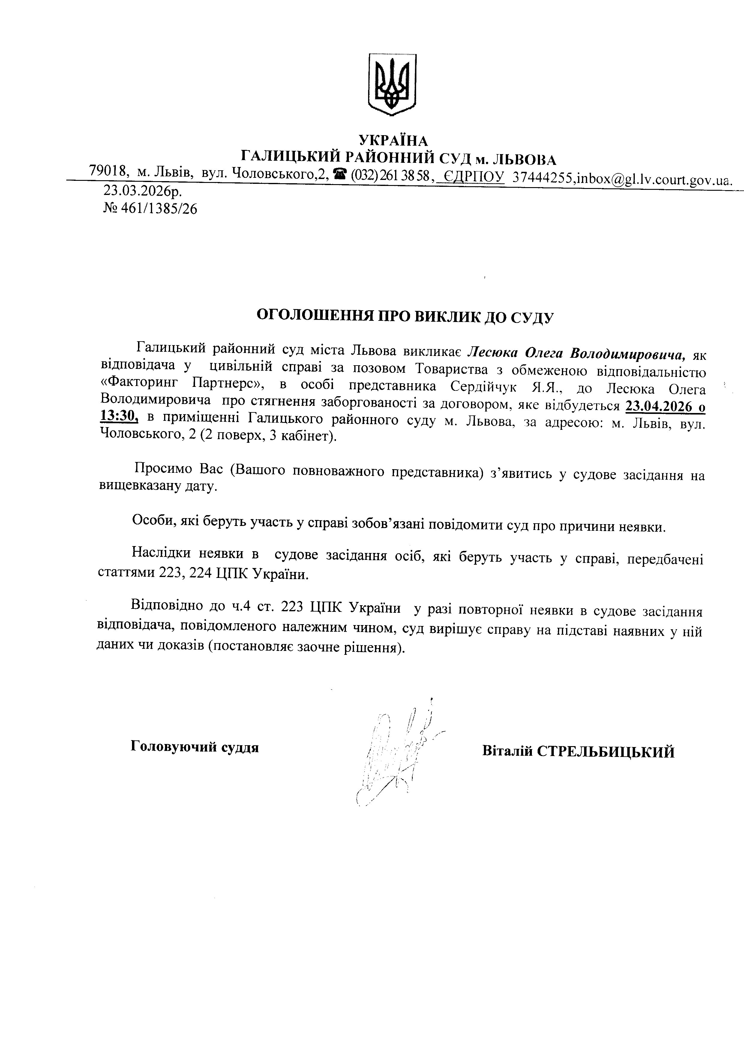 Оголошення про виклик до суду Лесюка О.В.