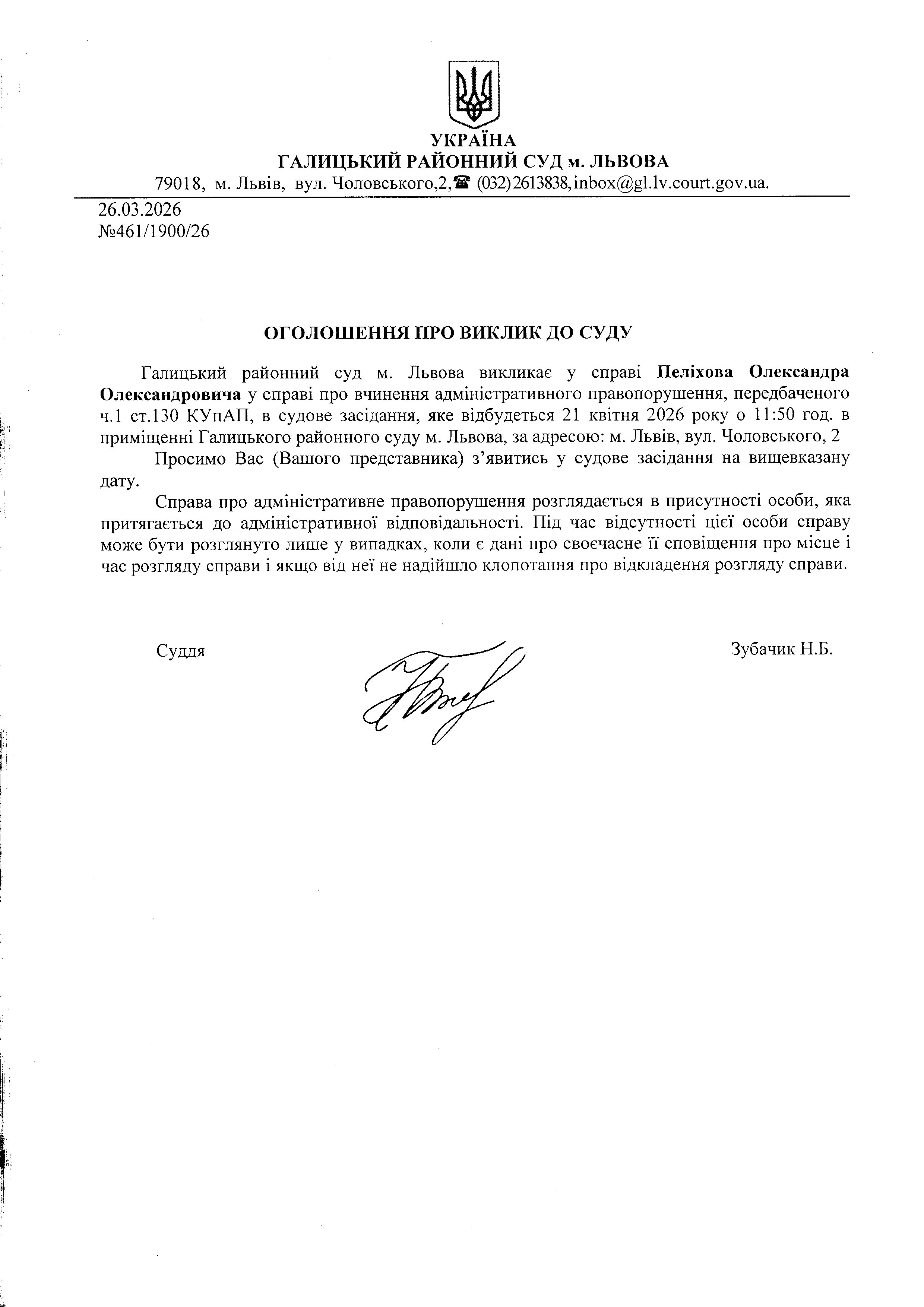 Оголошення про виклик до суду Пеліхова О.О.