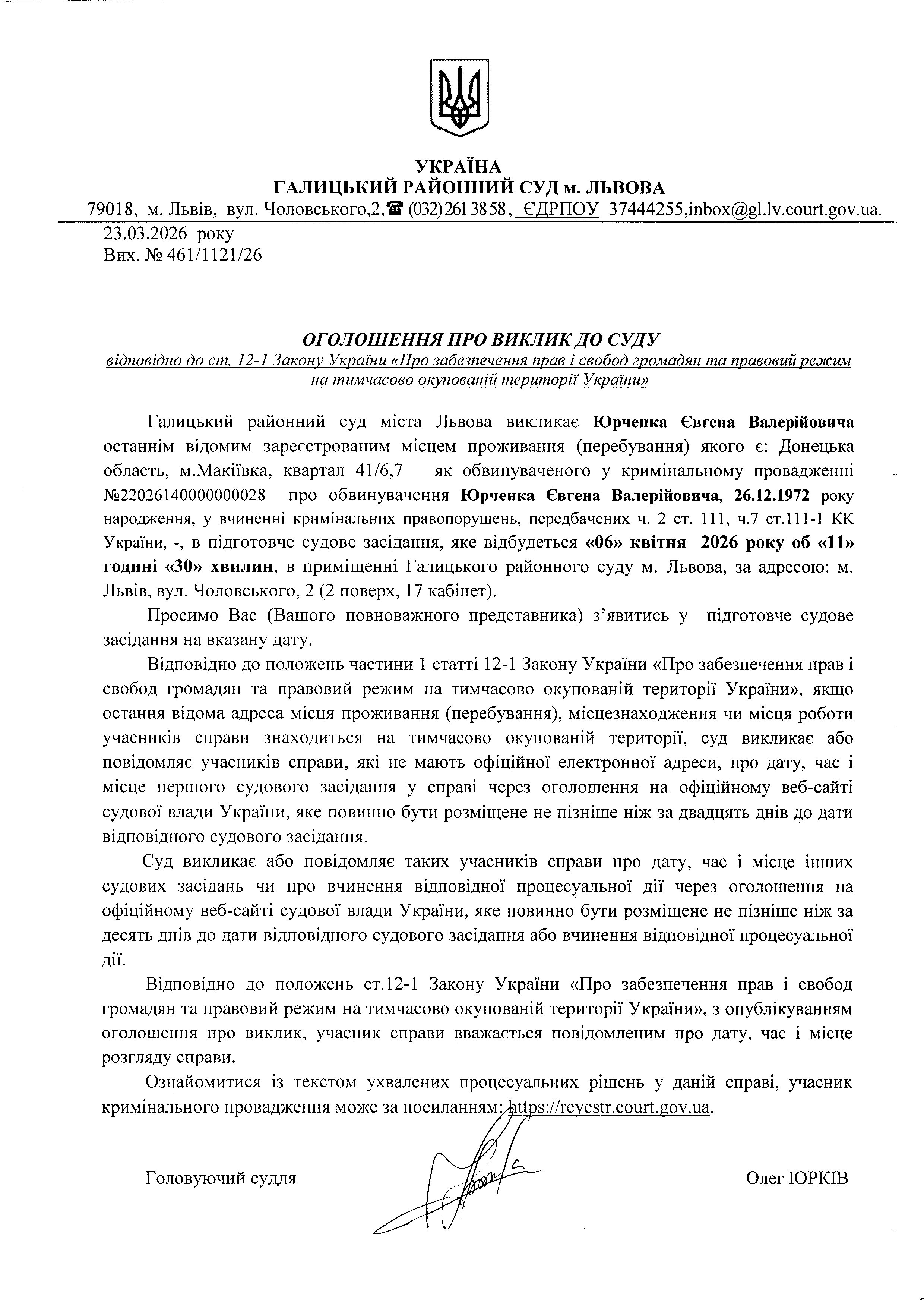 Оголошення про виклик до суду Юрченка Є.В.