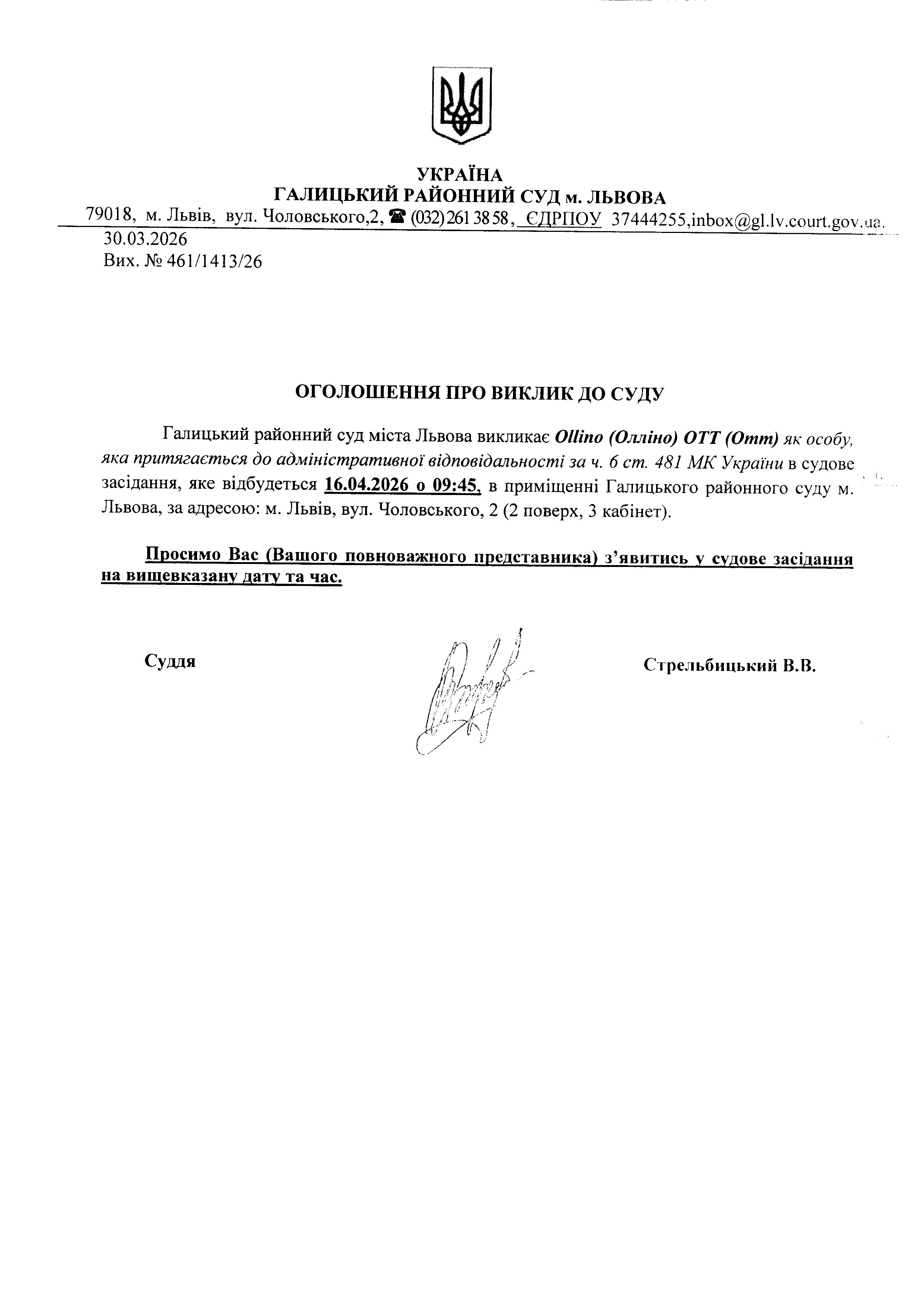 Оголошення про виклик до суду Ollino (Олліно) OTT (Отт)