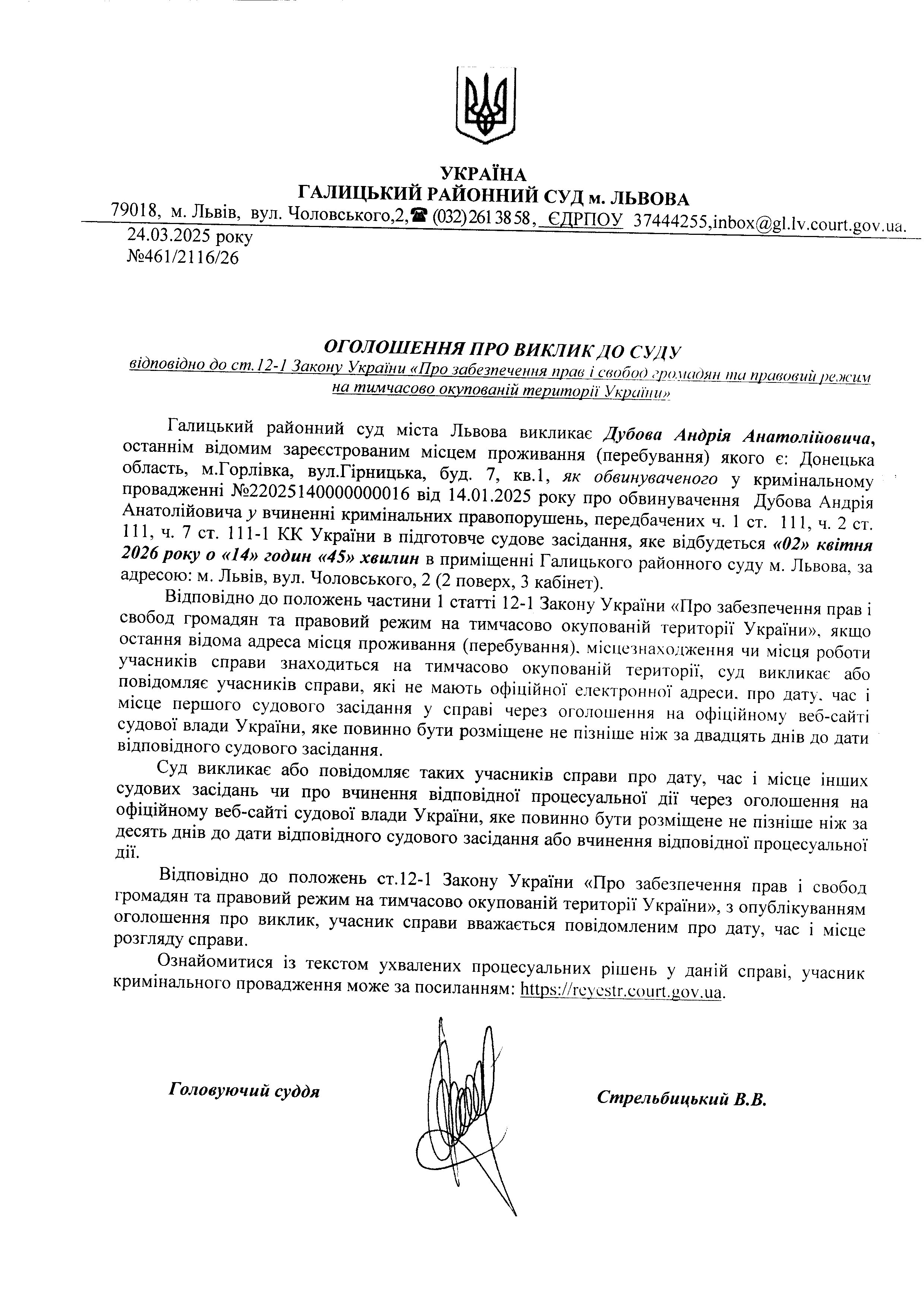 Оголошення про виклик до суду Дубова А.А.
