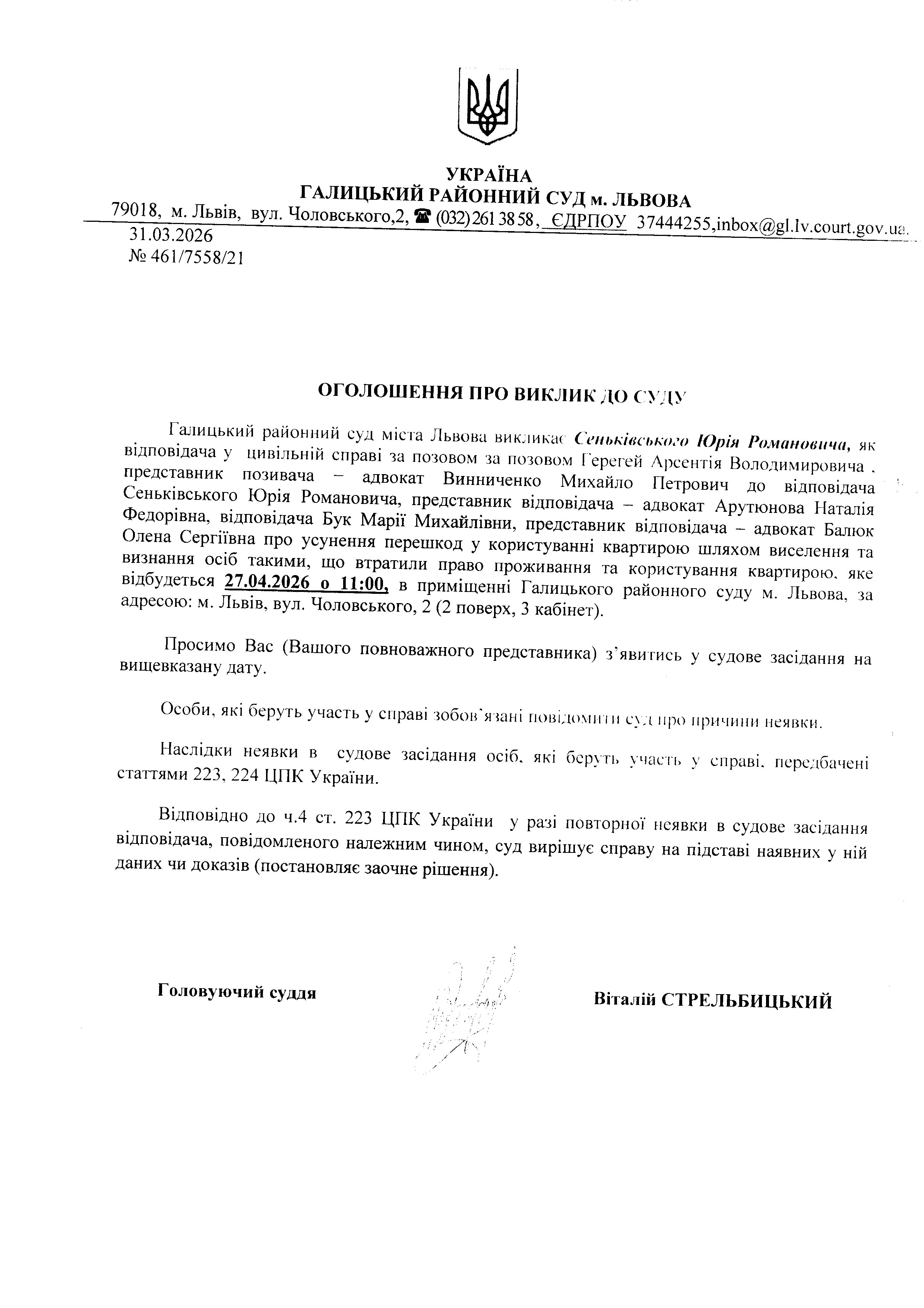 Оголошення про виклик до суду Сеньківського Ю.Р.