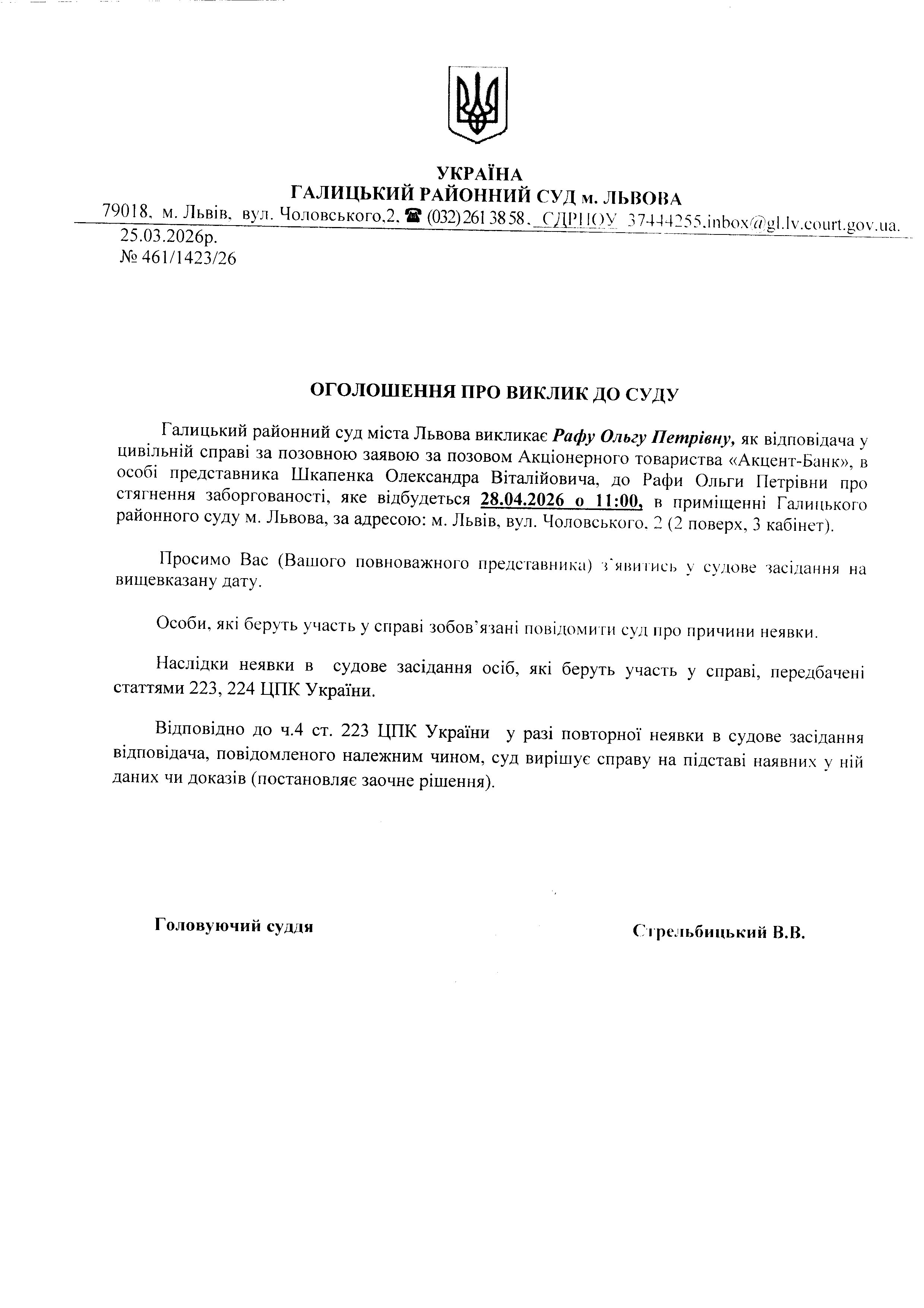 Оголошення про виклик до суду Рафу О.П.