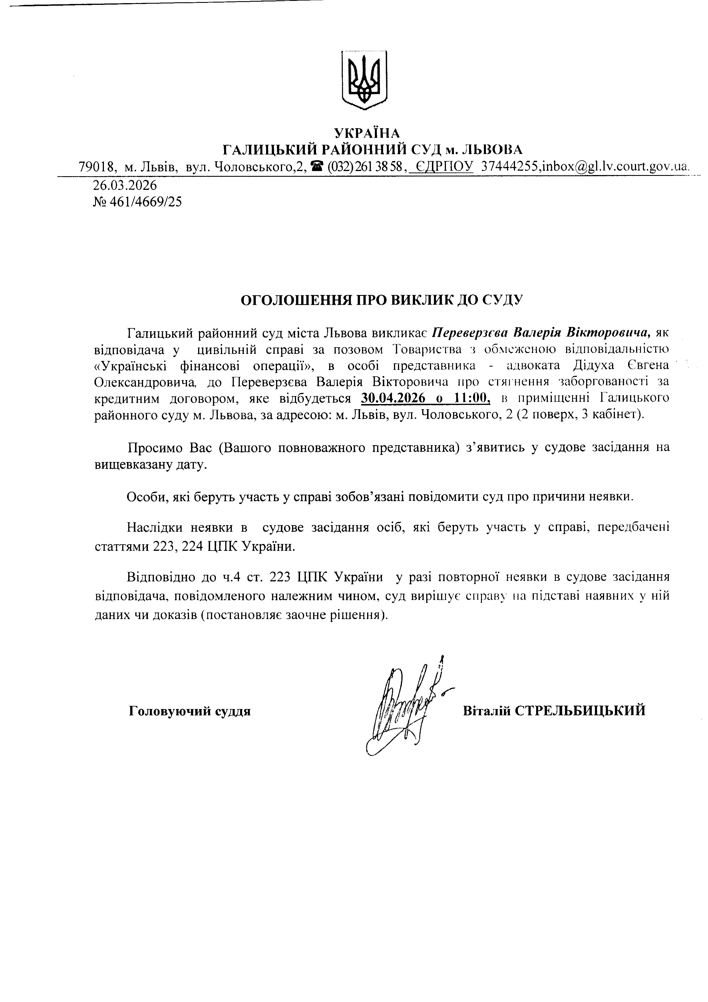 Оголошення про виклик до суду Переверзєва В.В.