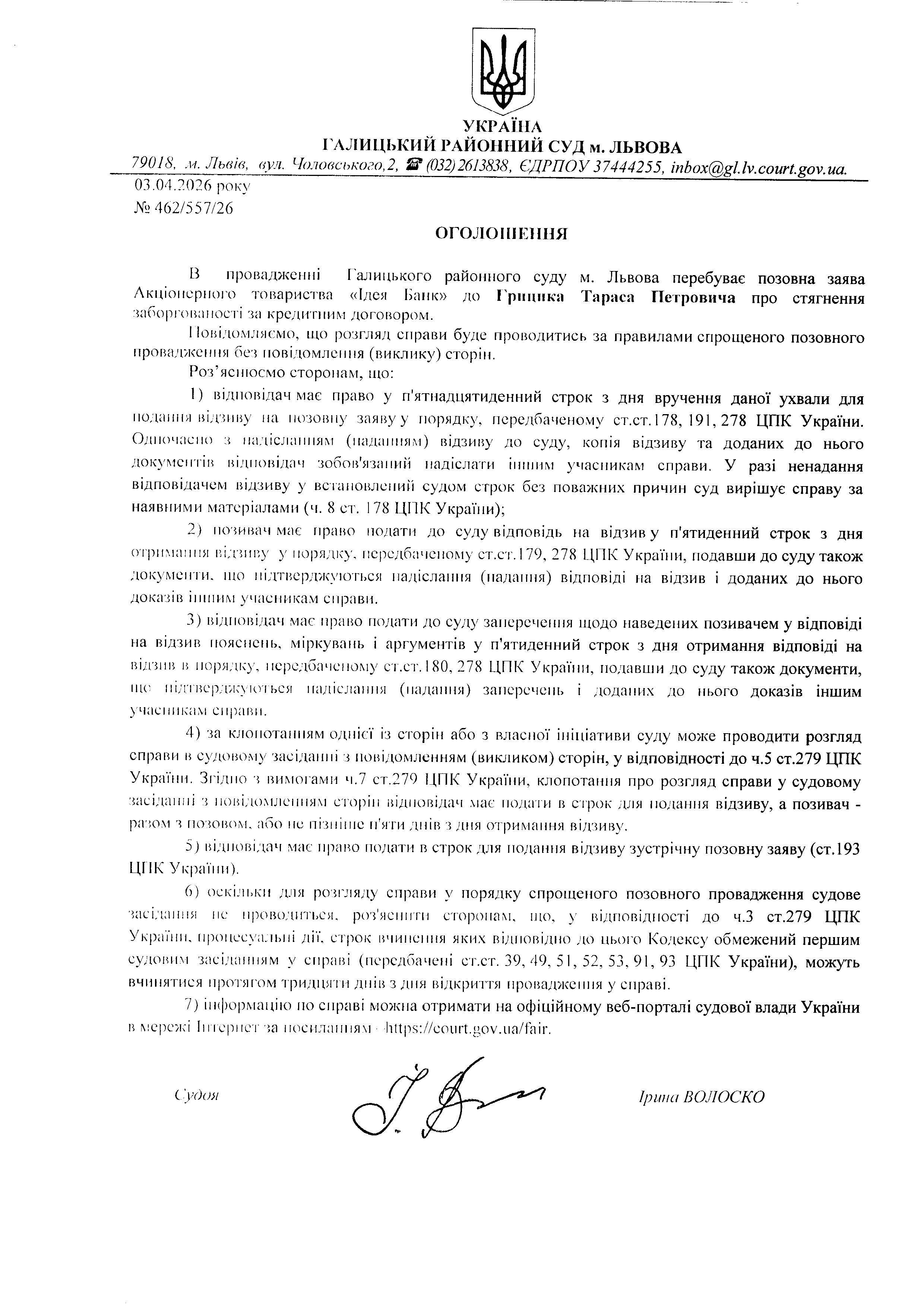 Оголошення про виклик до суду Грицика Т.П.