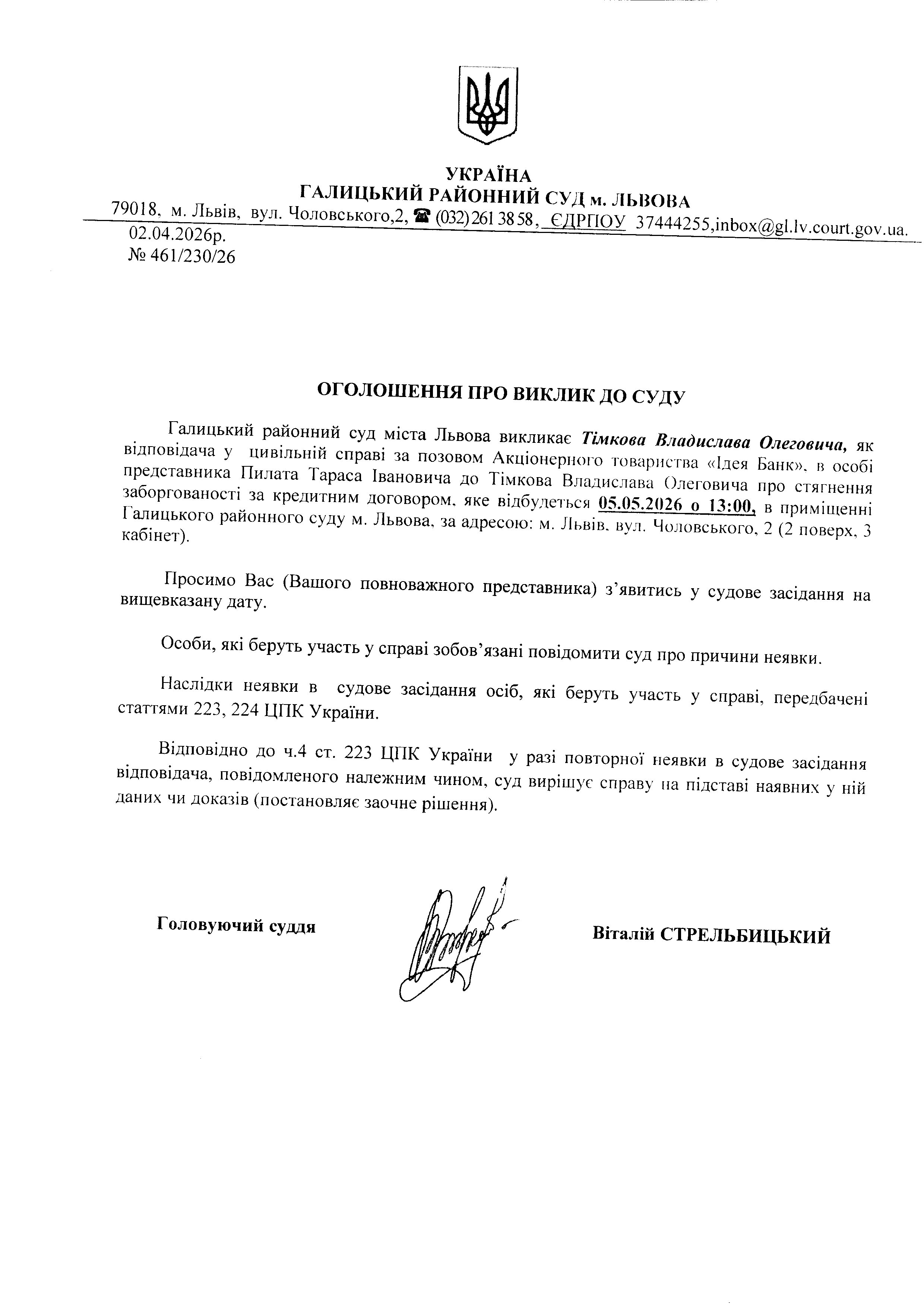 Оголошення про виклик до суду Тімкова В.О.