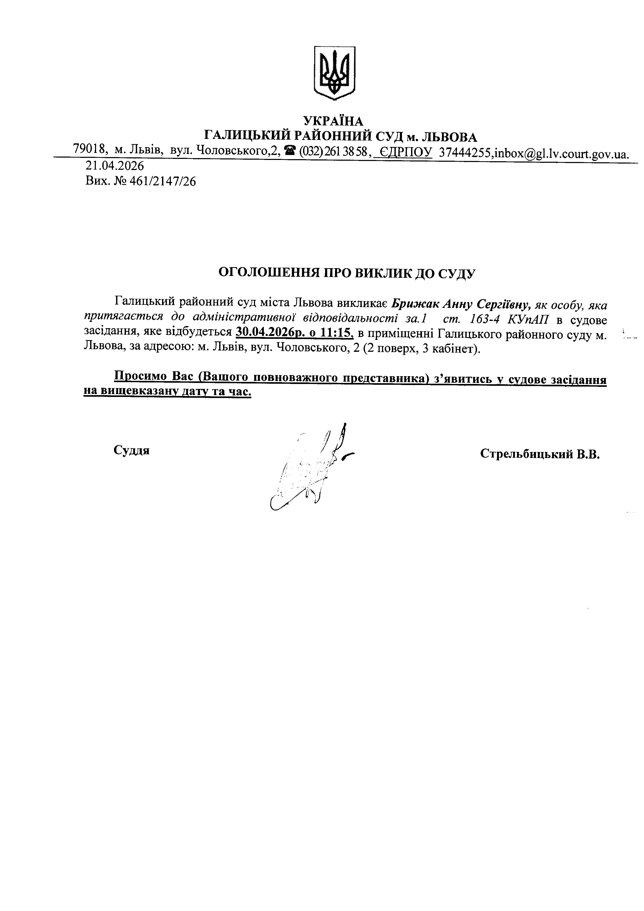 Оголошення про виклик до суду Брижак А.С.