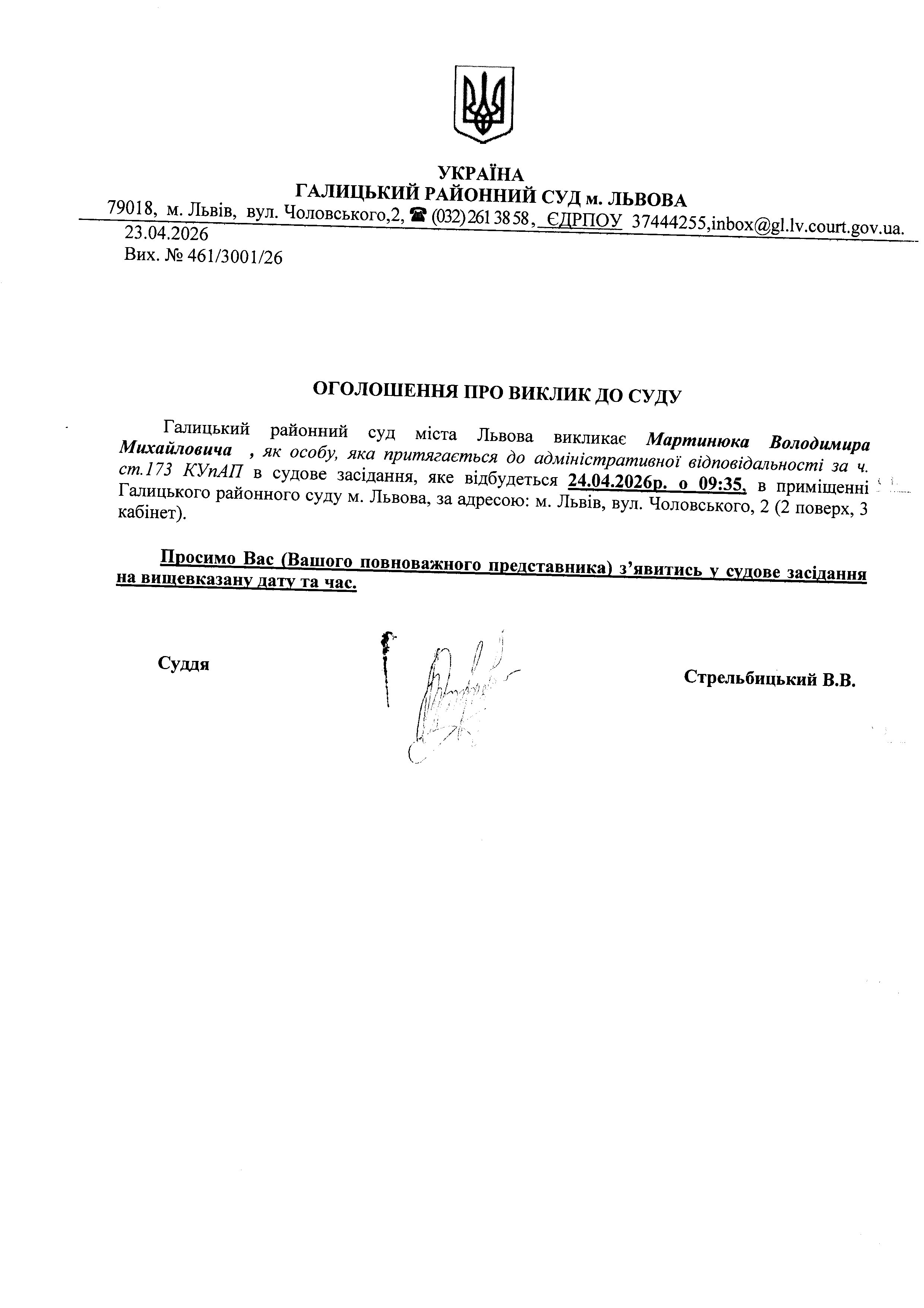 Оголошення про виклик до суду Мартинюка В.М.