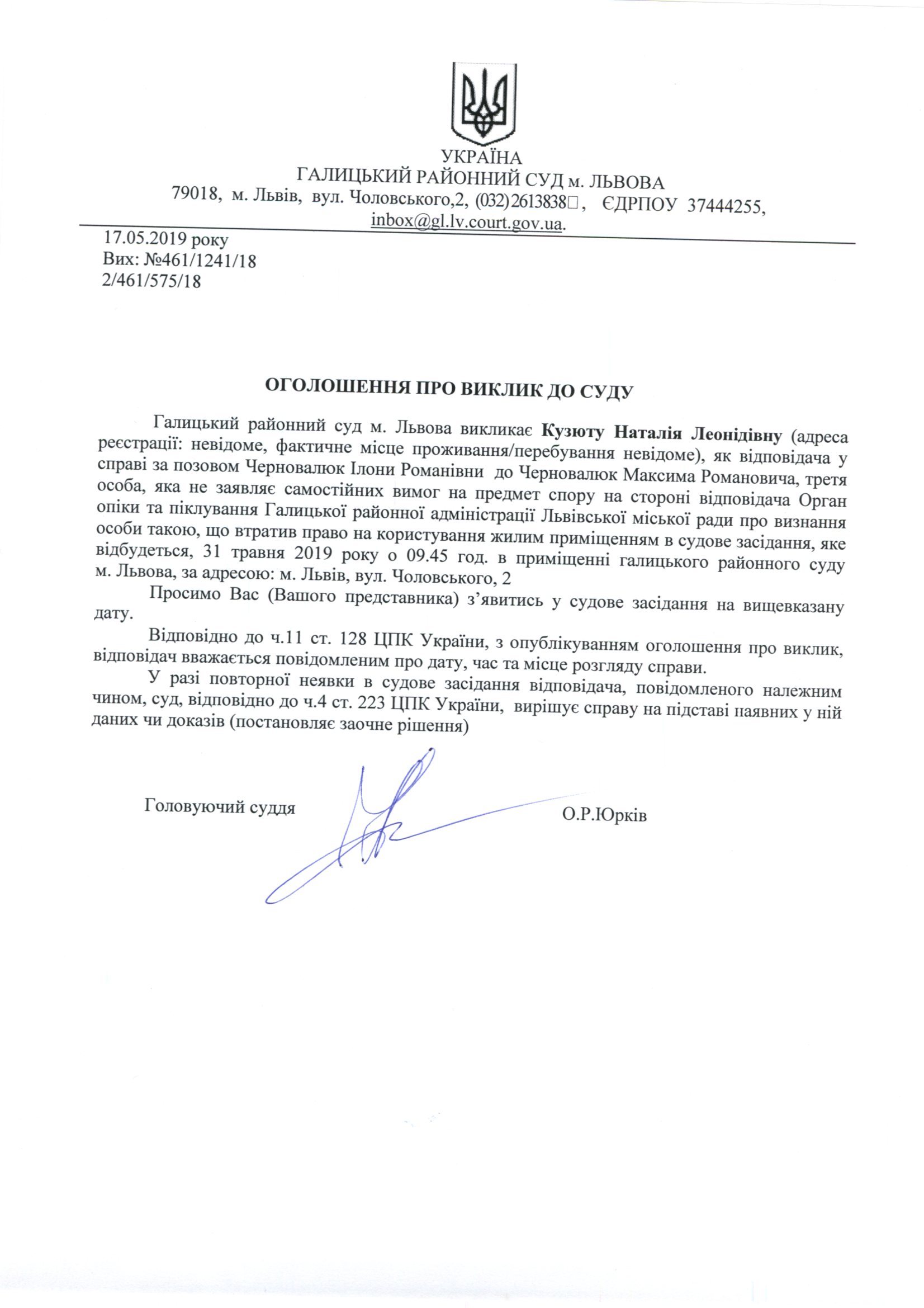 Оголошення про виклик до суду Кузюти Наталії Леонідівни