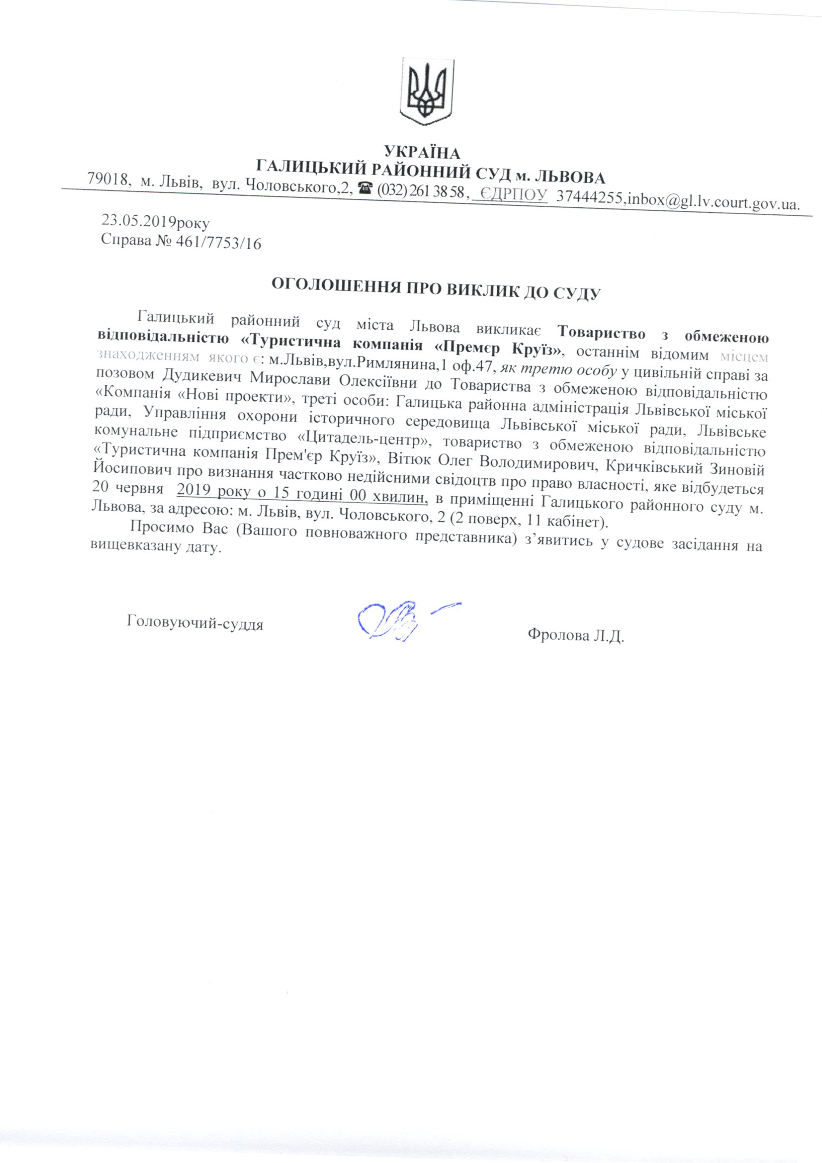 Оголошення про виклик до суду представника Товариства з обмеженою відповідальністю "Туристична компанія "Прем'єр Круїз"