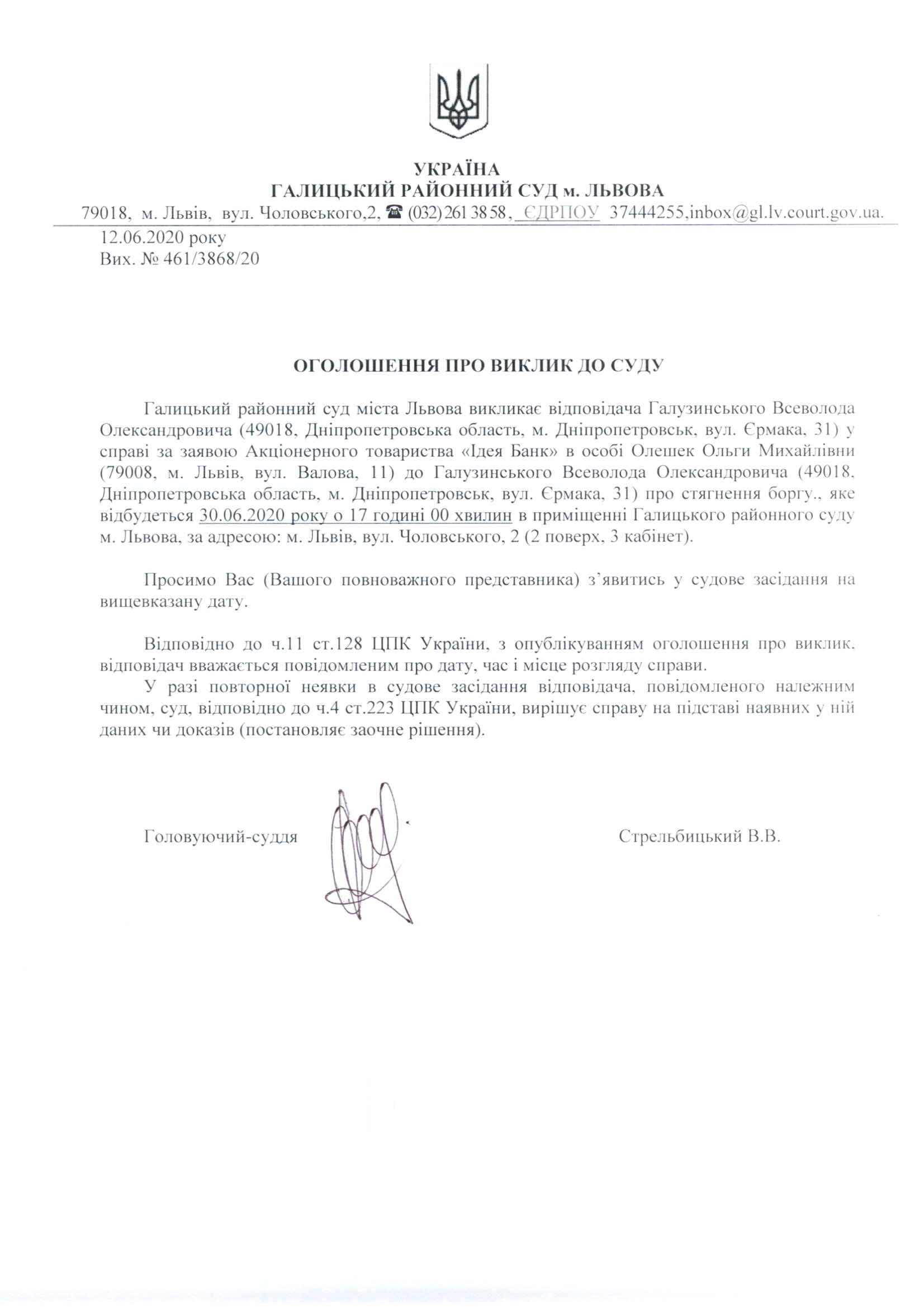 Оголошення про виклик до суду Галузинського Всеволода Олександровича
